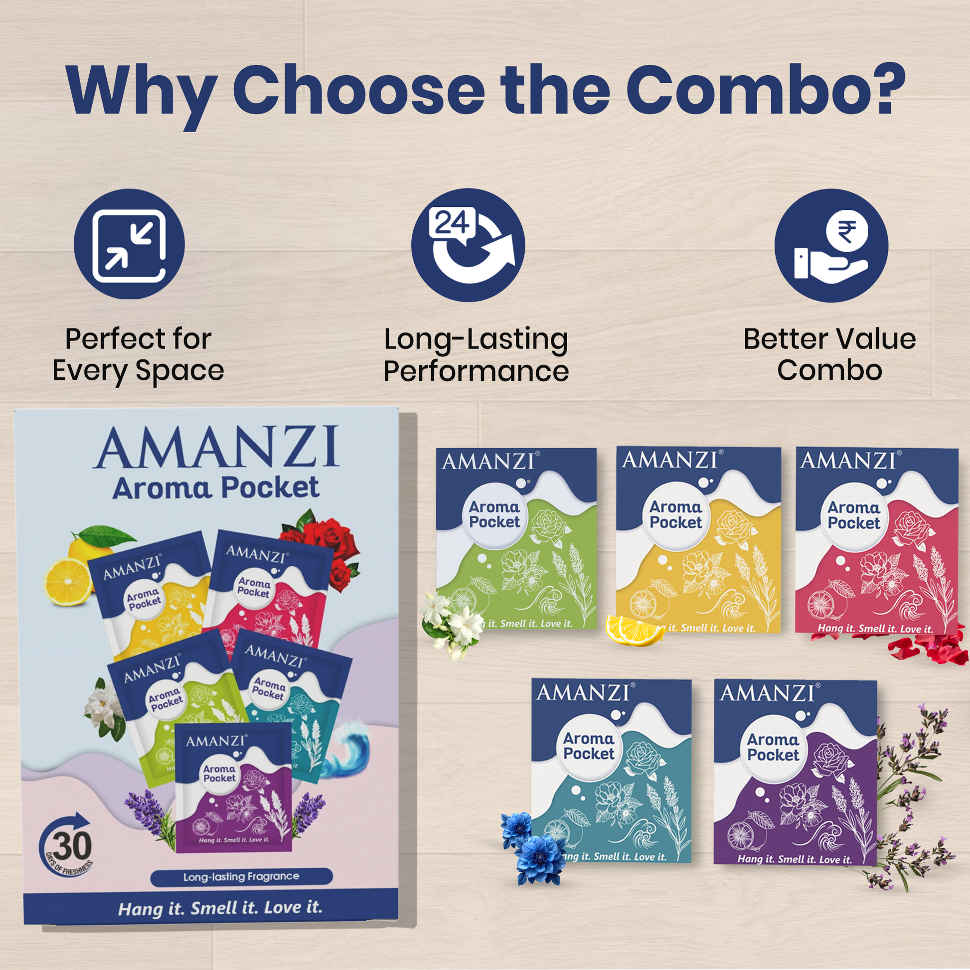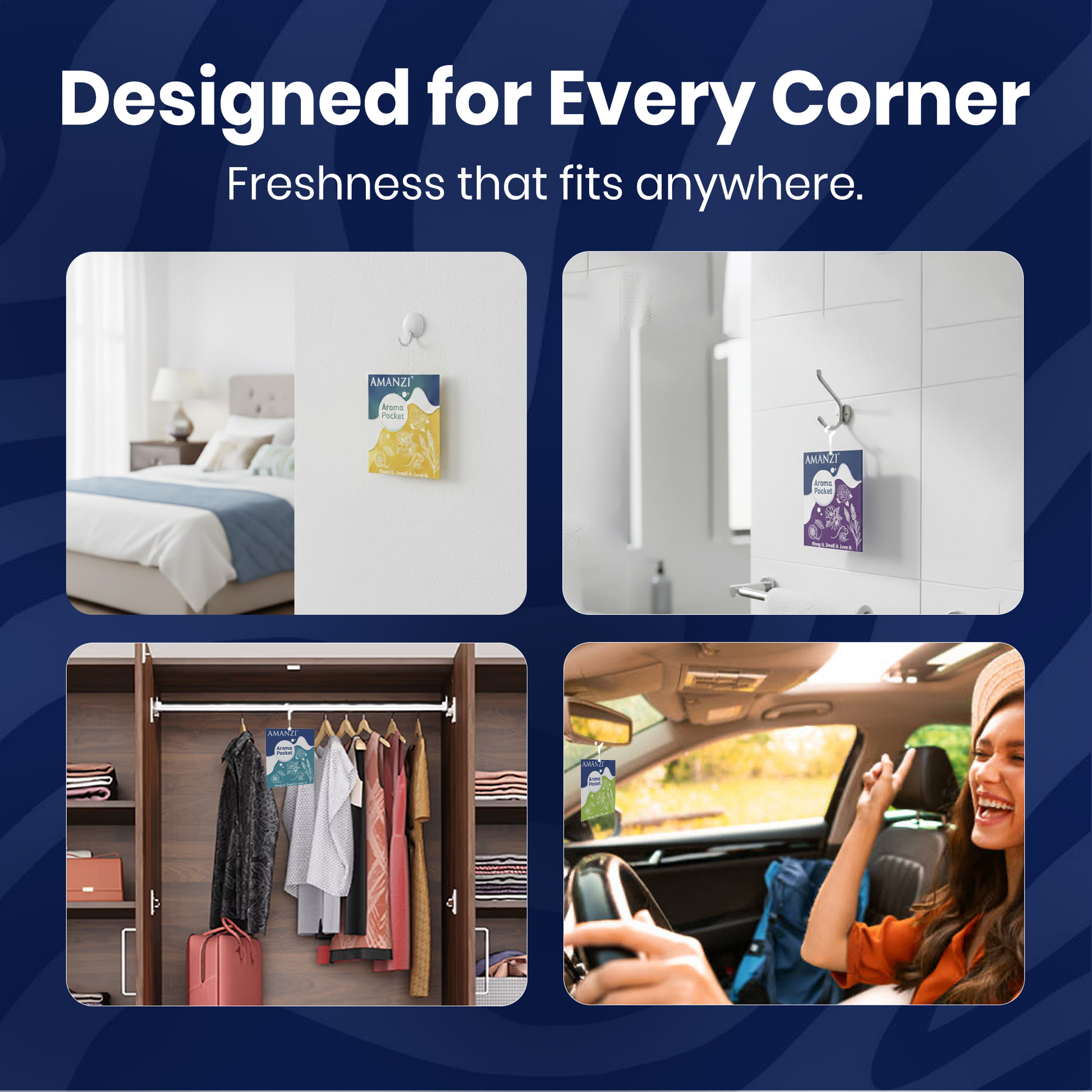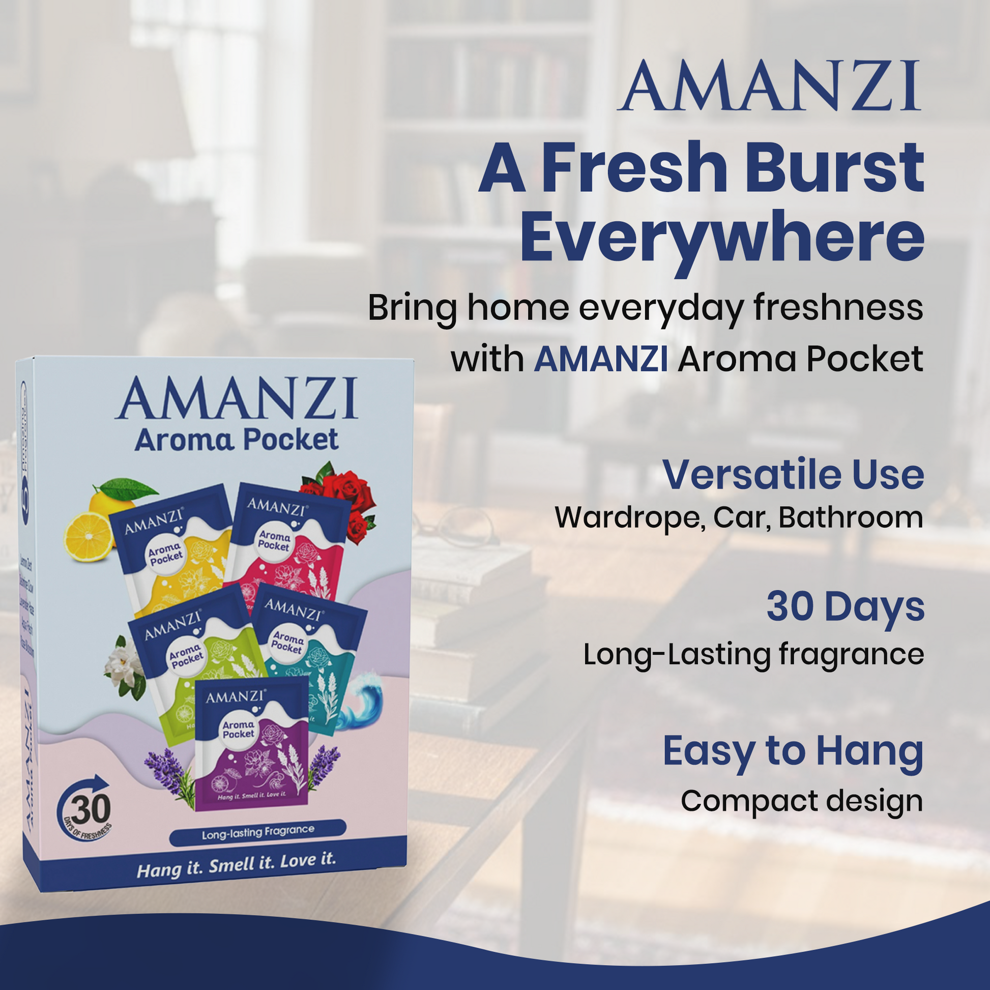 Pack includes 5 units of 10g each AMANZI Aroma Pocket Air Freshener, designed for long-lasting freshness across multiple spaces.