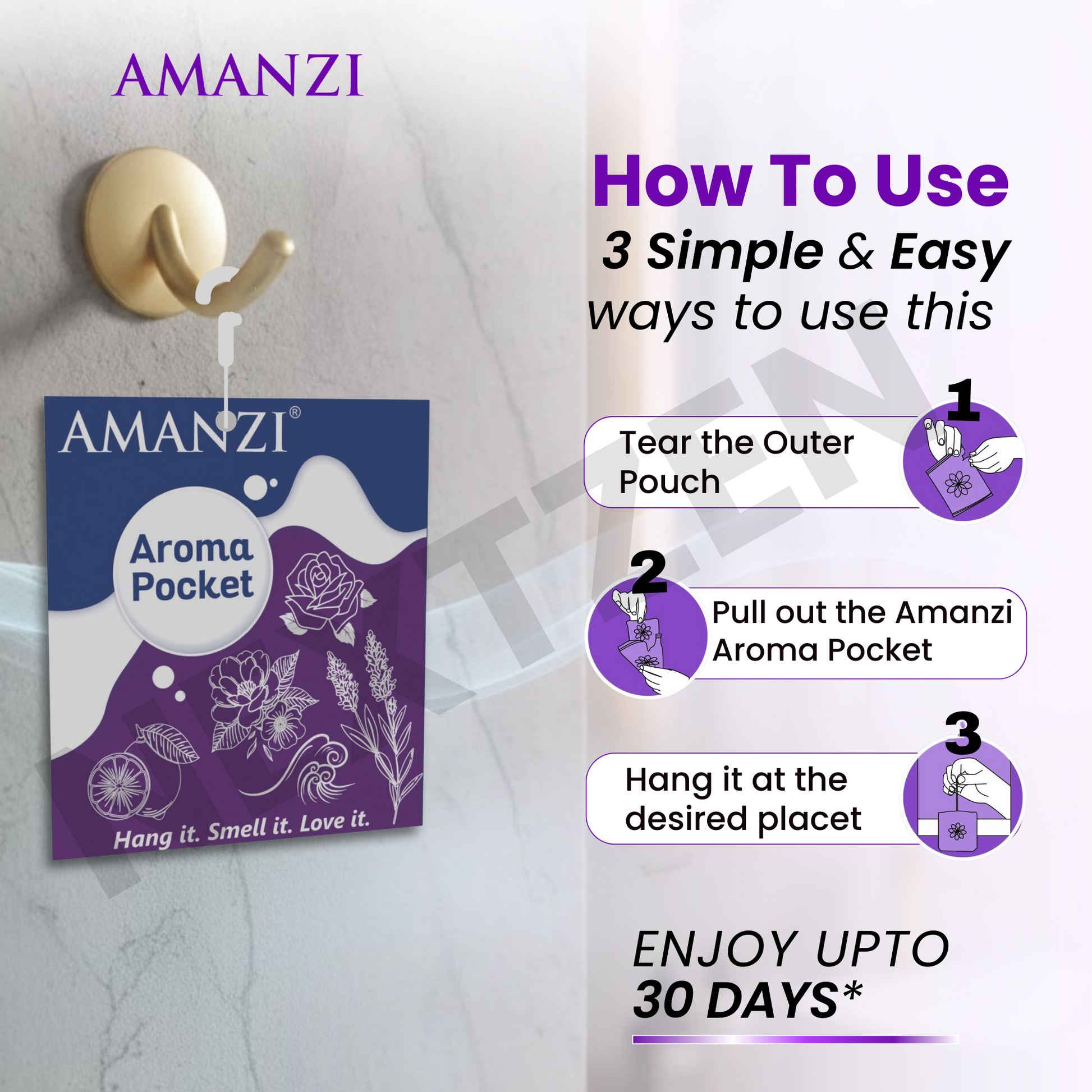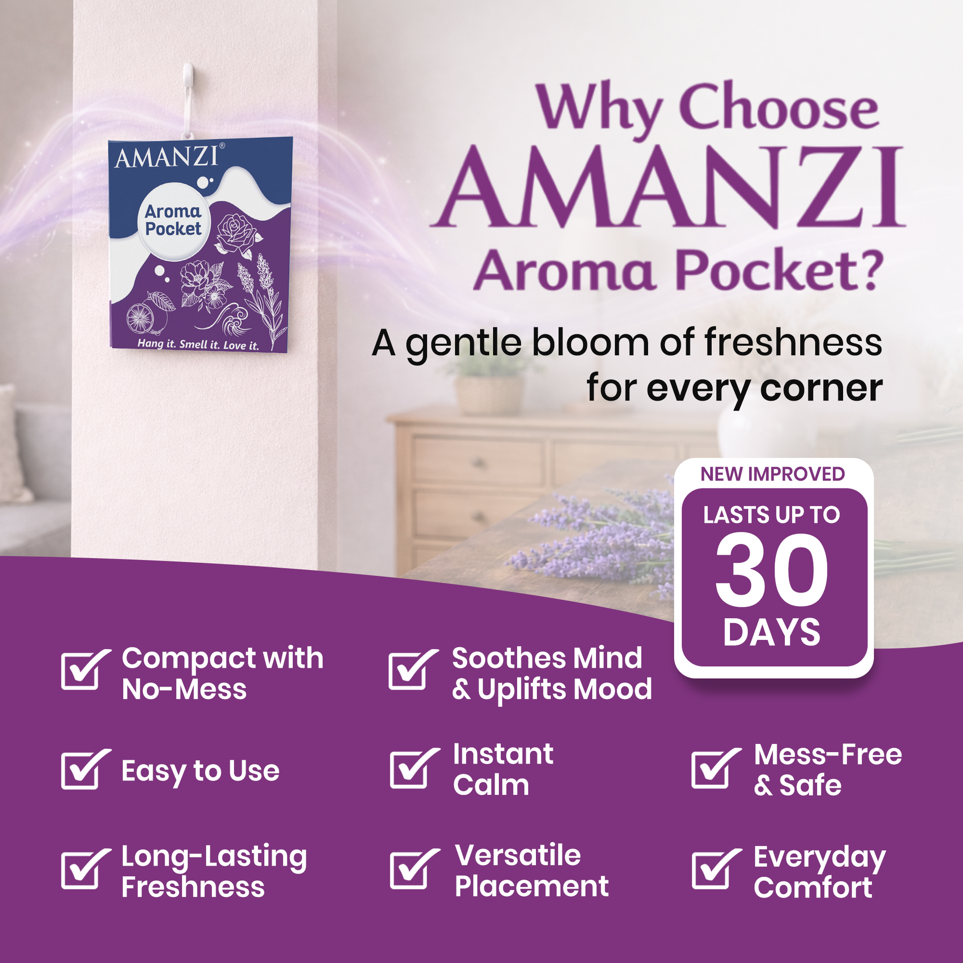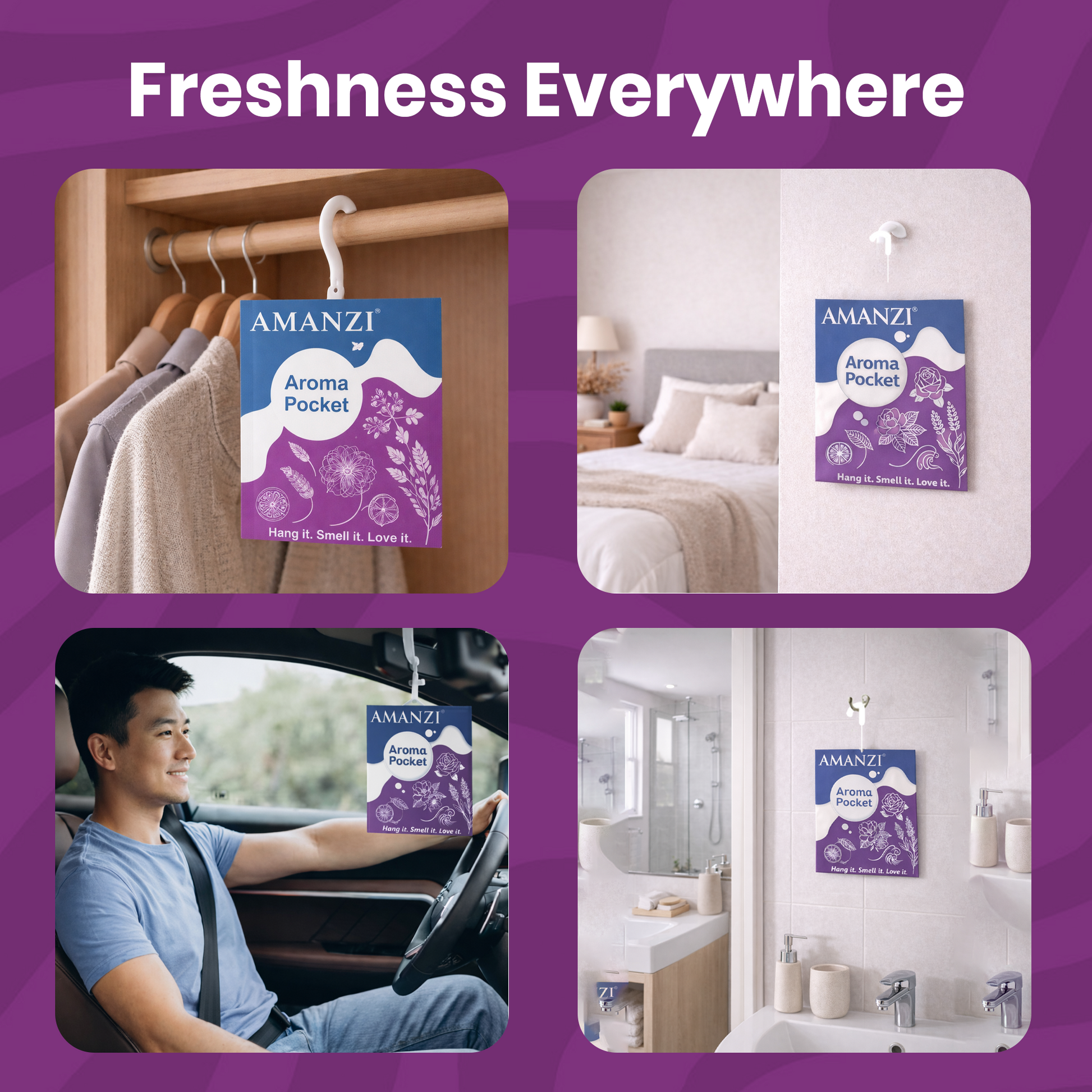 Pack includes 5 units of 10g each AMANZI Aroma Pocket Air Freshener, designed for long-lasting freshness across multiple spaces.